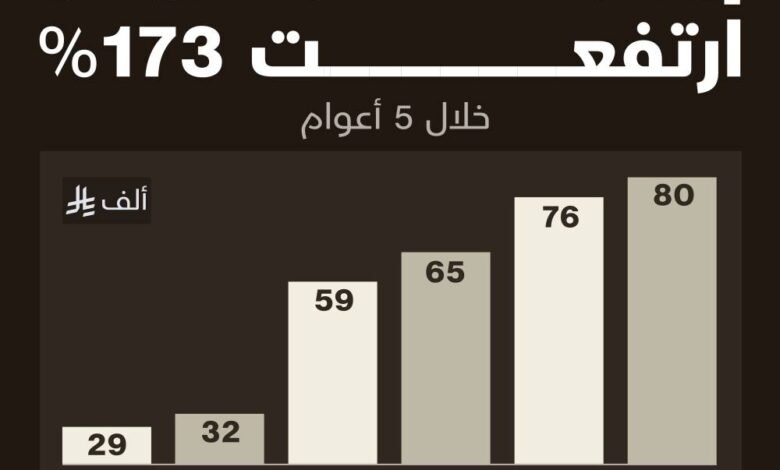 وبحسب وحدة التحليل المالي في الاقتصادية، استنادا إلى بيانات منصة “عقار”، ارتفعت إيجارات الشقق في شمال الرياض 173% خلال 5 أعوام، لتصل إلى متوسط 80 ألف ريال بنهاية أغسطس الماضي، مقارنة بـ29 ألف ريال في 2020، وذلك لعينات من 21 حيا تشمل شققا مكونة من 3 غرف.