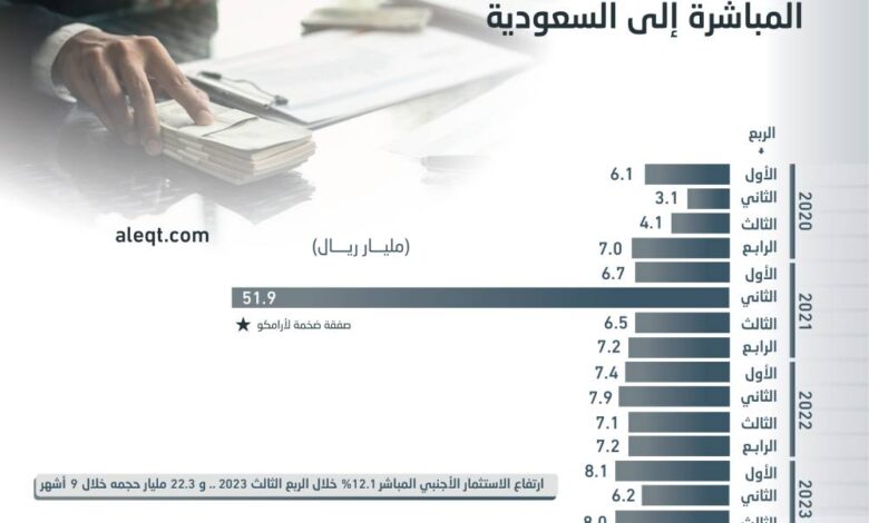جذبت السعودية استثمارات أجنبية مباشرة بنحو ثمانية مليارات ريال (2.1 مليار دولار) خلال الربع الثالث 2023، مقابل 7.1 مليار ريال “1.9 مليار دولار” خلال الفترة نفسها من عام 2022، مرتفعة 12.1 في المائة.