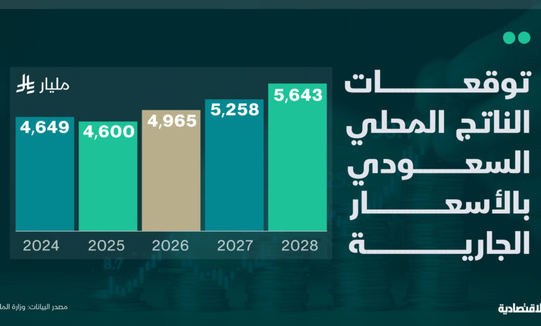 رفعت وزارة المالية توقعاتها لحجم الناتج المحلي بالأسعار الجارية إلى 4.6 تريليون ريال في 2025، ثم إلى 4.97 تريليون ريال في 2026، ويصل ذروته في 2028 عند 5.64 تريليون ريال.
