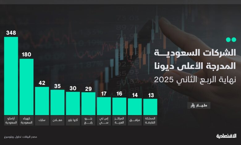 بين الشركات، الصدارة لأرامكو السعودية بديون تفوق 348 مليار ريال بنهاية الربع الثاني، ثم كهرباء السعودية نحو 179 مليار ريال، وسابك 42 مليار ريال، ومعادن 35 مليار ريال، وأكوا باور 30 مليار، ثم وبترورابغ وإس تي سي وسينومي سنترز ومرافق والمملكة القابضة ما بين 29 و13 مليار ريال.