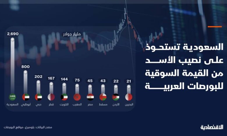 استحوذت سوق الأسهم السعودية “تداول” على نصيب الأسد بـ64% من القيمة السوقية للبورصات العربية البالغة 4.24 تريليون دولار، تليها الإمارات بسوقيها أبوظبي ودبي.