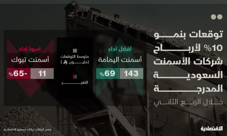 وبحسب وحدة التحليل المالي في “الاقتصادية”، استنادا إلى توقعات صادرة عن 6 بيوت خبرة تشمل “الراجحي المالية”، “الرياض المالية”، “الأهلي المالية”، “سيكو”، “المتحدة”، و”قيمة كابيتال”، ينتظر أن تسجل “أسمنت اليمامة” أرباحا بنحو 143 مليون ريال بنمو 69%، فيما يتوقع أن تكون “أسمنت تبوك” الأضعف أداء، مع تراجع بنسبة 65% إلى 10.9 مليون ريال.