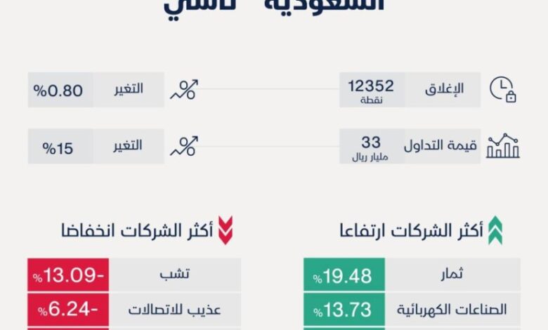 أسهمت البنوك في دفع مؤشر “تاسي” إلى الارتفاع لتنهي الأسبوع على ارتفاع 97 نقطة بـ0.80 % ليغلق عند 12352 نقطة بعد أسبوع من الخسائر.