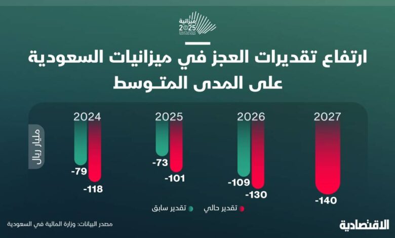 فيما ارتفعت تقديرات العجز لعام 2025 بنحو 38 % إلى 101 مليار ريال، كذلك صعد 19 % في 2026 إلى 130 مليار ريال، ثم 140 مليار ريال في 2027.