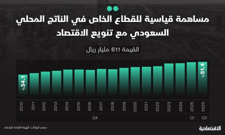 كانت حصة القطاع الخاص من الناتج المحلي السعودي 50.9% في الناتج خلال الربع السابق (الأول 2025)، و51.1% في الربع المقارن (الثاني 2024).
