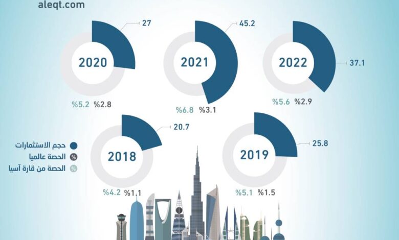 خلال الأعوام الخمسة الماضية (2018-2022) بلغ حجم الاستثمار الأجنبي المباشر لدول الخليج نحو 155.8 مليار دولار، 29 في المائة منها سجل خلال 2021، فيما مثلت تدفقات العام الماضي نحو 23.8 في المائة.