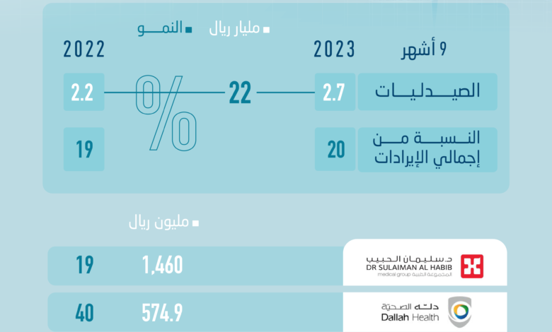 ونمت مبيعات قطاع “الصيدليات” خلال الفترة 22 في المائة ما رفع مساهمته من إجمالي إيرادات الرعاية الصحية إلى نحو 20 في المائة مقارنة بنحو 19 في المائة للفترة نفسها من عام 2022، مقابل نمو الخدمات الطبية 16 في المائة.