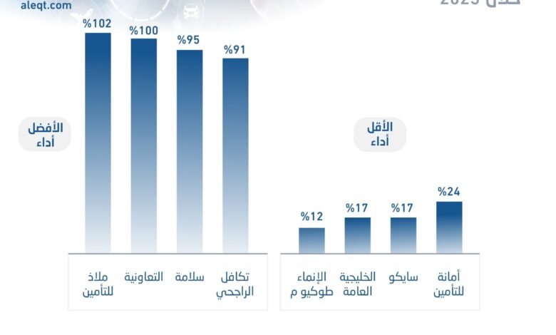 ومن بين شركات التأمين المدرجة، حققت أربع شركات مكاسب سوقية واسعة تجاوزت 90 في المائة، في مقدمتها شركة ملاذ للتأمين الذي صعد سهمها بأكثر من 102 في المائة منذ بداية العام.