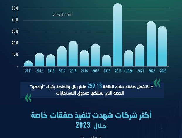 34.55 مليار ريال قيمة الصفقات الخاصة في الأسهم السعودية خلال 2023 .. 34 % لشركتين
