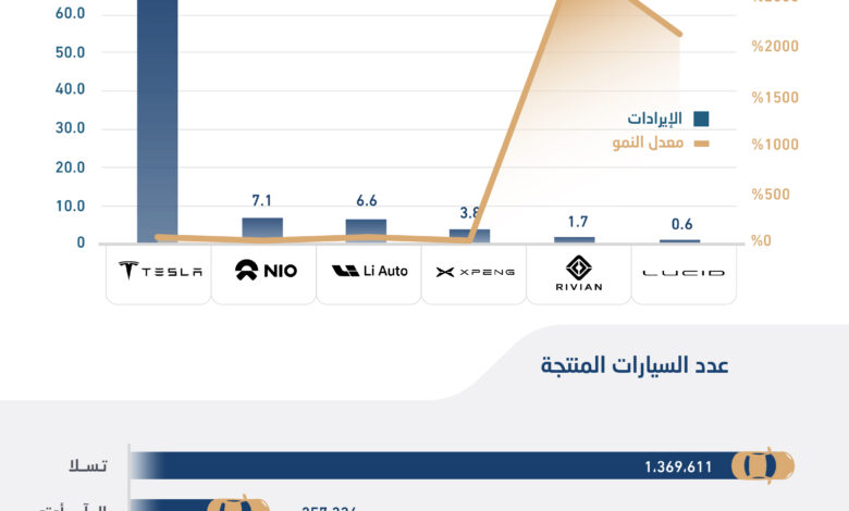 ووفقا لرصد وحدة التقارير في “الاقتصادية”، استند إلى البيانات السنوية والمالية لشركات “تسلا، نيو، لوسيد، إكس بينج، ريفيان، إل آي أوتو”، فقد تصدرت شركة “تسلا” الأمريكية في الإنتاجية بنحو 1.37 مليون سيارة خلال 2022 بنمو 47 في المائة مقارنة بـ930 ألف سيارة خلال عام 2021.