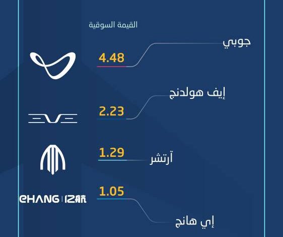 تليها شركة “إيف هولدنج” البرازيلية التابعة لشركة أمبراير بقيمة سوقية تقدر بـ2.23 مليار دولار. وتنتج الشركة طائرات إقلاع وهبوط رأسية كهربائية وبنية تحتية للتنقل الجوي في المناطق الحضرية. وفي المرتبة الثالثة تأتي شركة “آرتشر” الأمريكية بقيمة سوقية تقدر بنحو 1.29 مليار دولار.
